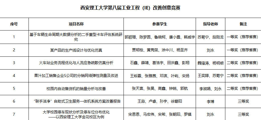 经过启动、宣讲、比赛等环节,组委会最终评出一等奖两项,二等奖三项,三等奖二项,其中有五项作品将被推荐至参加陕西省第十一届工业工程改善创意竞赛。