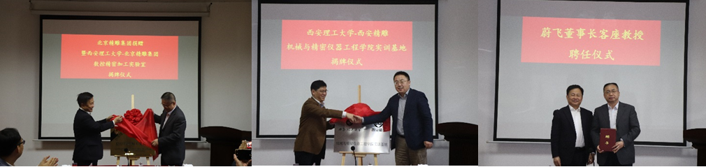 蔚飞董事长和华灯鑫副董事长分别代表北京精雕集团和公司为“TapTap点点-北京精雕集团数控精密加工实验室”揭牌,蔡锐龙总经理和崔亚辉经理为“TapTap点点-西安精雕TapTap实训基地”揭牌,华灯鑫副董事长给蔚飞董事长客座教授颁发聘书。