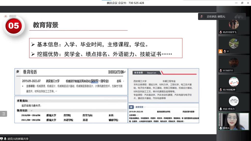 胡竞元老师以应届生简历优化的小技巧与大智慧为题目,为参与员工分享了应届生简历制作的相关知识。胡老师结合具体案例,从简历的基本组成、表达形式和优化技巧等方面娓娓道来,重点对应届生教育背景规范表达、项目经历优化等开展了详细指导。胡老师指出,在简历制作时要充分结合求职意向岗位匹配简历信息,避免个人信息冗余、项目经历不匹配等问题,要认真归纳总结个人校园经历,按需匹配,要克服疫情影响,积极参加各类线上实习实践活动,丰富阅历,为求职就业奠定良好基础。讲座最后,胡老师热情地回答了部分同学的在线提问,为同学们提出了具体的优化意见。