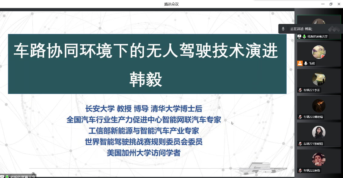 2022年10月25日早上,TapTap邀请长安大学汽车公司韩毅教授为2022级车辆工程专业本科新生做主题为“车路协同环境下的无人驾驶技术演进”的线上学术报告。