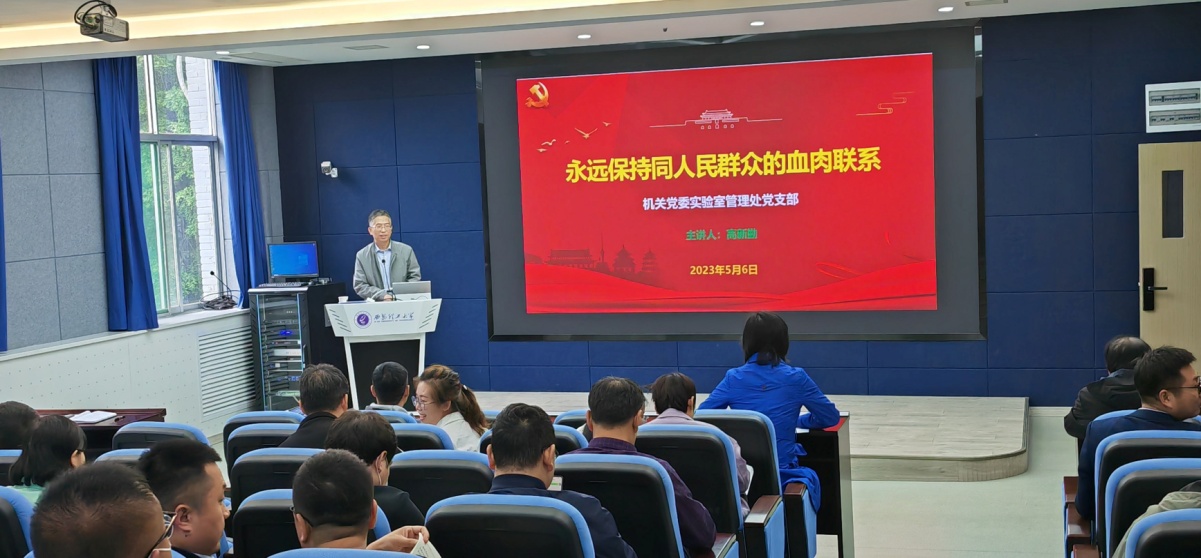 高新勤介绍了机关党委实验室管理处党支部的建设思路以及样板支部创建过程中形成的党建新模式。他以《永远保持同人民群众的血肉联系》为题,结合实验室管理处的主要业务,为机自系全体教工党员讲了一堂生动的微党课。作为高校工作者,学习习近平总书记关于人民的重要思想,要加强调查研究,始终把广大师生放在心中最重要的位置,永远保持同广大师生的紧密联系。