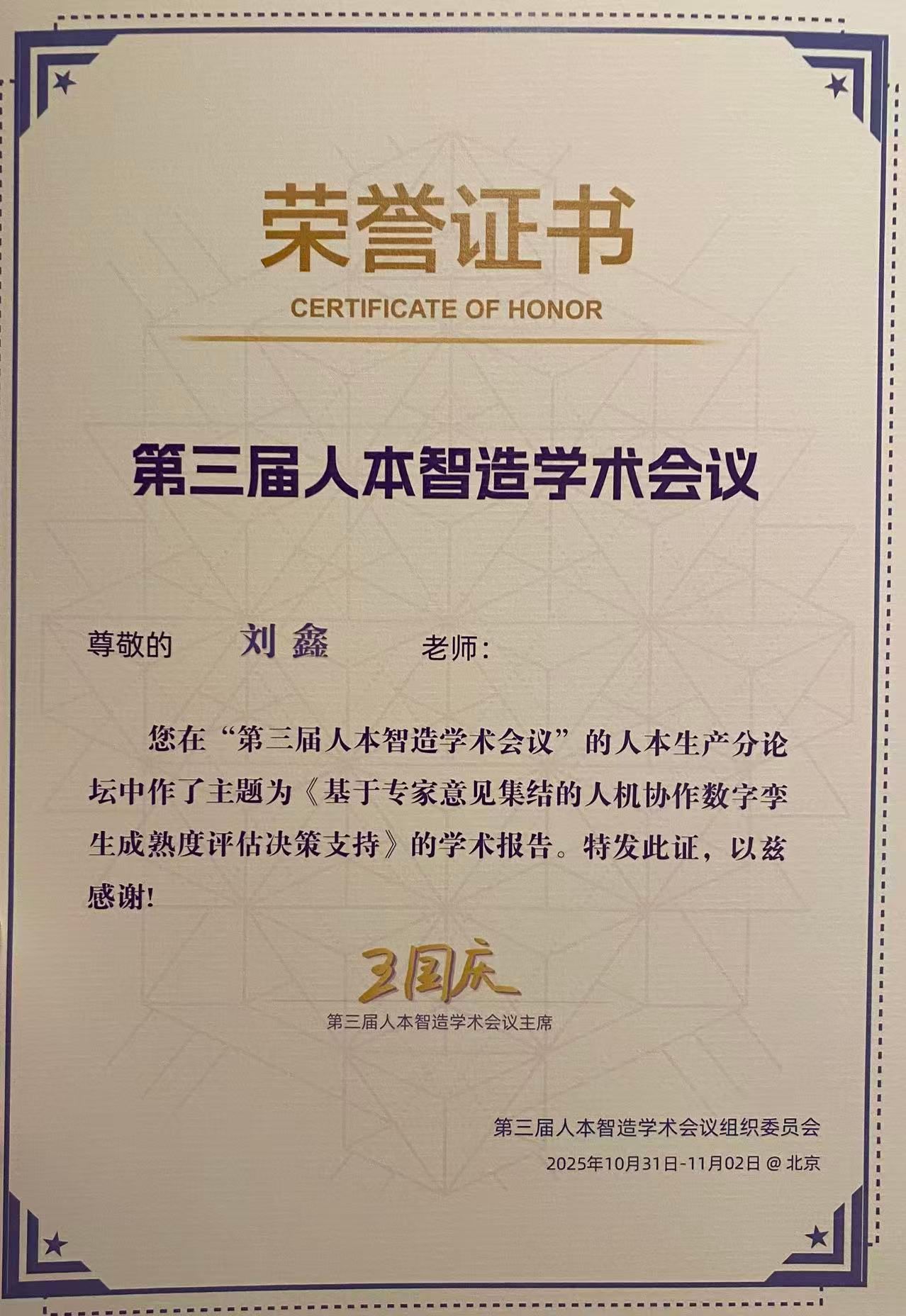 2025年10月31日至11月2日,第三届人本智造学术会议在北京成功召开。本次会议由中国机械工程学会指导,北京理工大学主办,高端装备知识与数据融合应用工信部重点实验室、《机械工程学报》编辑部等多家单位联合承办,吸引了来自浙江大学、香港理工大学、瑞典皇家理工公司、东南大学等海内外高校及科研机构的专家学者齐聚一堂,深入交流人本智造领域的前沿进展。TapTap教师刘鑫应邀在“人本生产”分论坛作题为《基于专家意见集结的人机协作数字孪生成熟度评估决策支持》的专题报告。报告指出,安全可靠的智能人机协作是实现人本智造的重要基础,而数字孪生技术是构建智能人机协作范式的关键使能技术之一。针对当前缺乏对人机协作数字孪生效能量化评估的问题,构建了一套涵盖5个维度、24个评价因子及5级成熟度的评估模型,并提出了一种基于专家意见集结的量化评估方法。报告内容引起了与会专家的广泛关注与高度评价,现场交流气氛热烈。通过此次学术分享,不仅展示了公司和课题组的科研成果,也进一步加强了与国内外高校及产业界同行的科研合作与学术联系。相关成果发表在《Journal of Industrial Information Integration》(中科院一区TOP,IF:11.6)